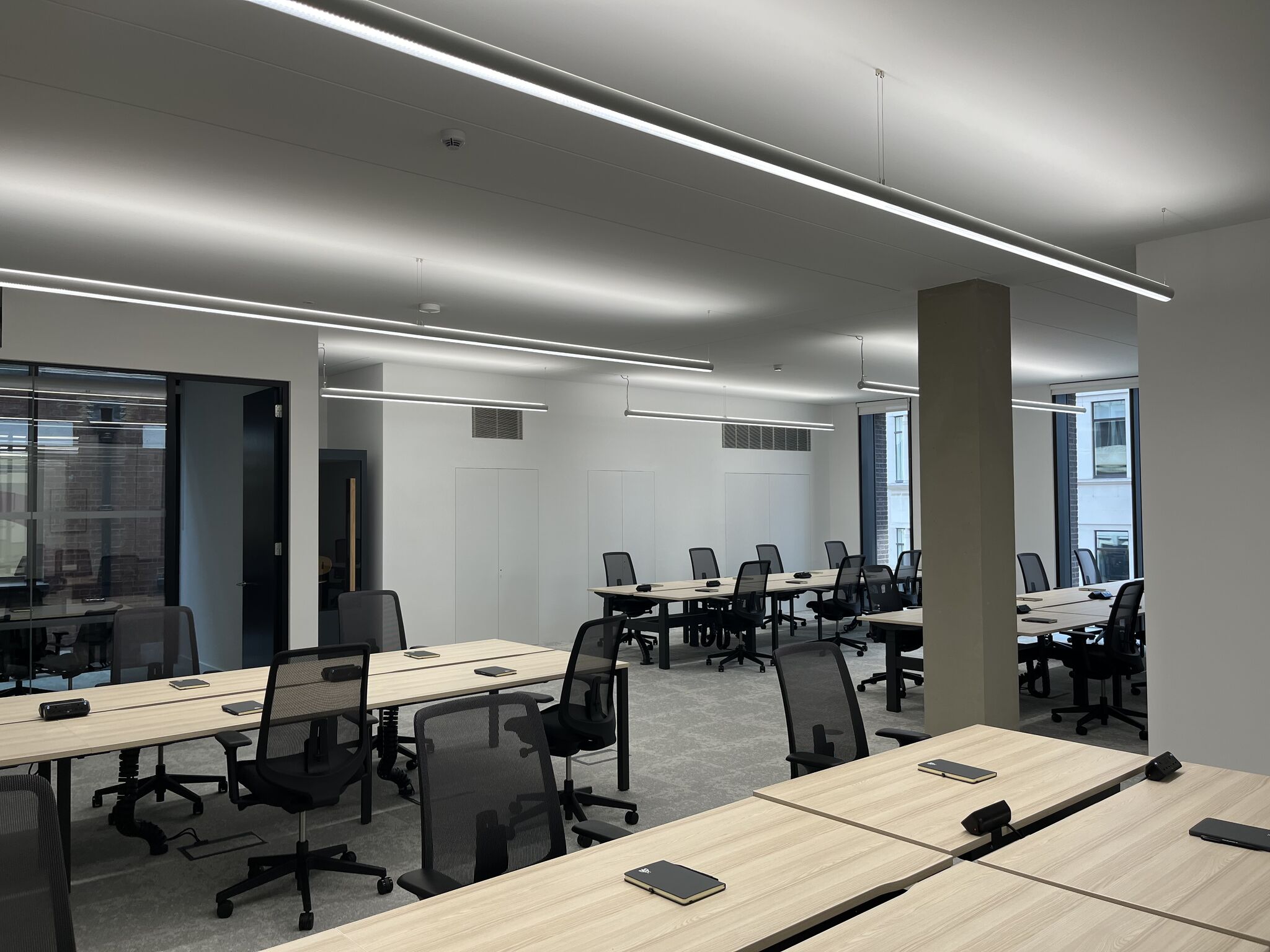 The electrical installation works consisted of new lighting, lighting controls, fire alarms, av systems, and power including busbar systems to 21,000 sq ft of co-working office space, meeting rooms, and break-out areas.